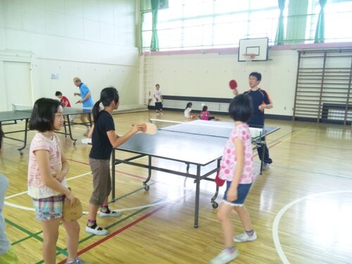 先週に引き続き2回目の卓球講座。今日もたくさんの児童が参加しました。宮野先生からは、前回より一回でも多く続けられるようにがんばってみて下さいと話しがありました。平田先生からは、フォアハンドとバックハンドの打ち方を習いました。手伝いに来てくれ…