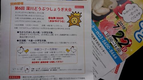 7月22日(日)、森下文化センターで、「第6回深川どうぶつしょうぎ大会」が開催されます。事前申し込みが必要なので、参加したい児童は直接森下文化センターに電話で申し込んでください。すぐに定員に達してしまう年もあるので、早目にお願いします!WES/津野