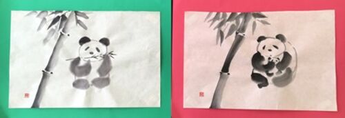 秋晴れが美しい菊の節句の今日も、書道の道具をもってみんな元気に図工室に集まってくれました。予定ではペンギンの親子を描くことになっていたのですが、先生から、ペンギンは今年から墨絵を始めた生徒さんにはちょっと難しくパンダのあかちゃんが生まれた…